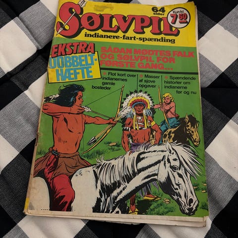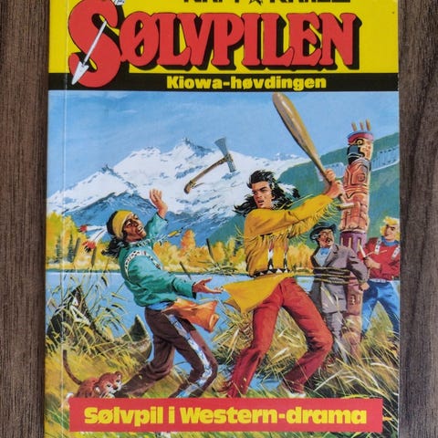 Sølvpil Den unge Kiowa-høvding tegneserier med titlerne "Overfaldet på postrytteren" og "Den beleirede prærieby". Serien indeholder western-tema og illustrationer med karakterer i indiansk og westernmiljø.