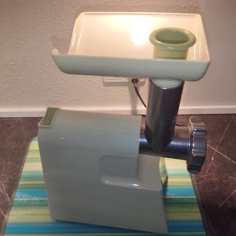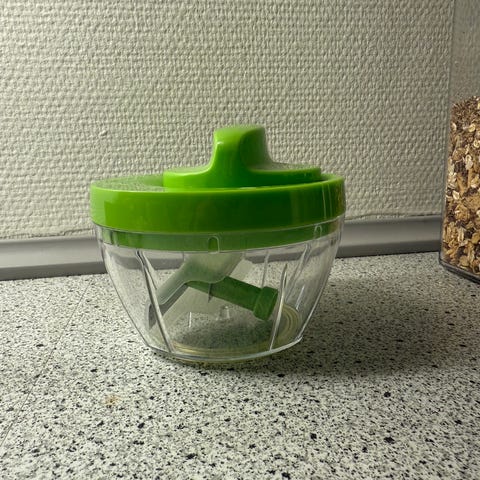 Maker Elektrisk grøntsagshakker i hvid farve. Designet til effektiv hakning af grøntsager med elektrisk funktion.
