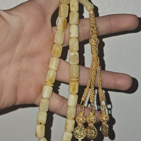 Seç begen, sıkma ve ateş kehribar tespihler, gümüş püsküllü,