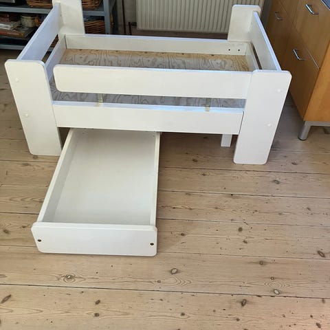 Brug men fuldt funktionel. Hulegardiner under og madras i overkøjen. Forstærket rutsjebane, så børnene kan gå op af den.