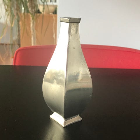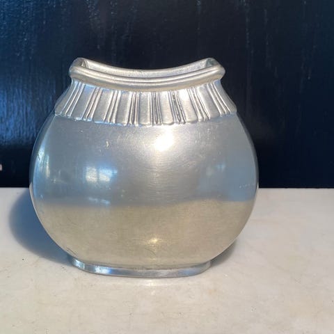 Kugleformet tinvase af Just Andersen. Den har levet i næsten 100 år, så fremstår selvfølgelig med brugsspor og patina, bl.a et par små tryk. Jeg har prøvet at fange dem med kameraet, men meget svært at fotografere. Man kan dog godt se dem på de sidste billeder. Så altså ikke perfekt, men et smukt samlerobjekt i meget pæn stand alderen taget i betragtning. Prisen justeret efter brugssporene.