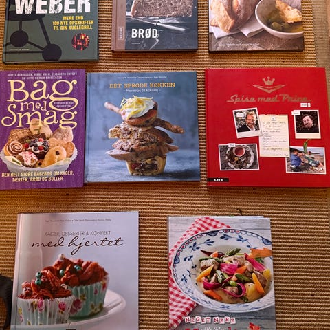 En samling af forskellige kogebøger med opskrifter og madlavningstips. Bøgerne dækker emner som slank mad, kylling, pizza og antipasti, samt generelle madlavningsvejledninger. Bøgerne er i forskellige størrelser og farver.