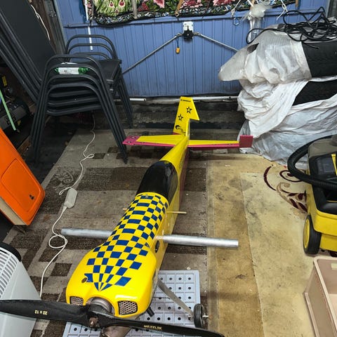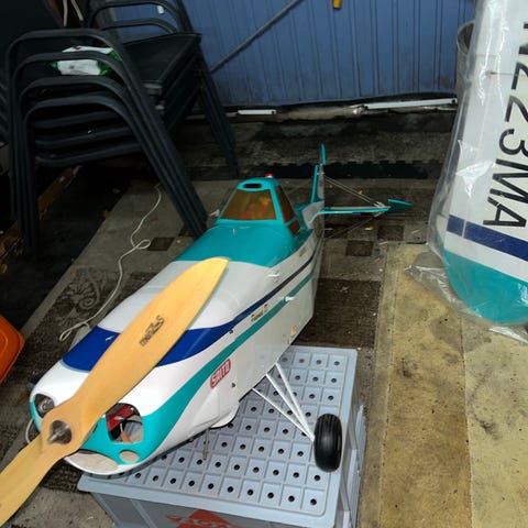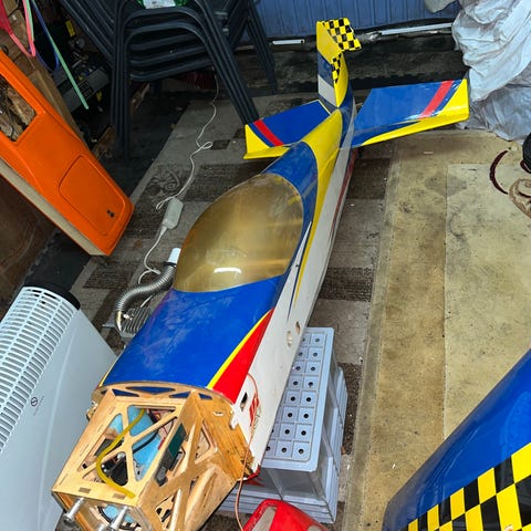 Model fly med rød, hvid og blå farvet design. Består af en cockpit med to figurer, motor og adskilte vinger og hale. Velegnet til hobbybrug og modelflyentusiaster.