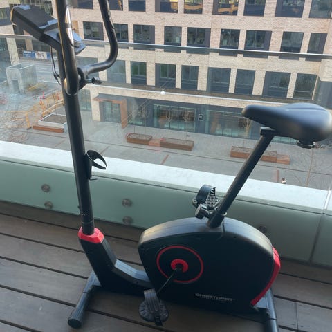 Christopeit Sport AL 2 motionscykel i hvid og sort. Udstyret med justerbart sæde og styr samt med elektronisk display med forskellige træningsprogrammer. Designet til indendørs brug. Jeg har selv brugt den til genoptræning efter en hofteoperation.