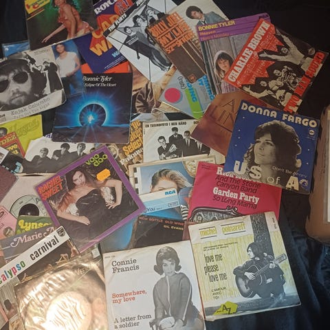 7" vinyl single samling uden covers. Flere af pladerne har desværre “buler” i kanten, Se venligst alle billederne