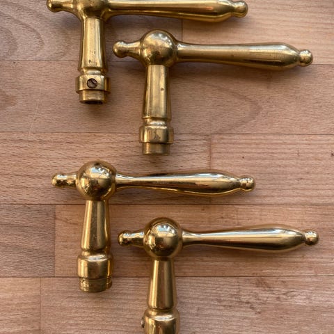Originale Coupe dørgreb i massiv messing, designet af danske Kaj Fischer for DBS i 1925. Meget smukke og med patina. Grebene måler ca 16 x 11 cm