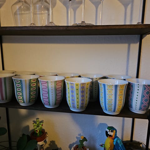 Kopperne er lavet af glasurbelagt porcelæn med et blåt mønster. De har en rund form.,Afhentes i:,Røde Kors Kolding (621),Bemærk at mail, chat og beskeder ikke besvares, og varen skal købes på knappen "Gå til varen"