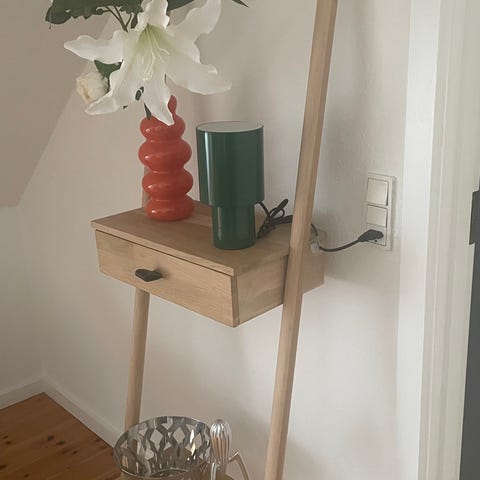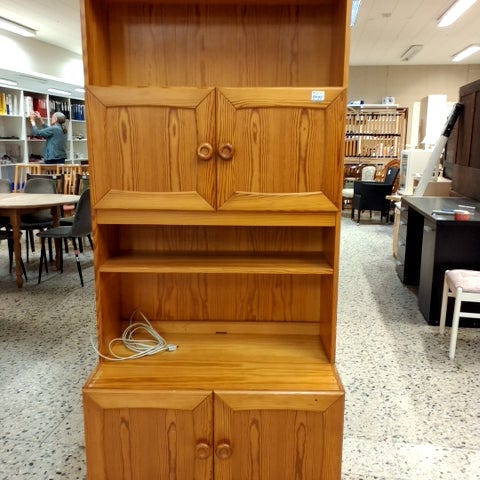 Reolen har tre åbne hylder og tre skuffer med runde greb. Den er lavet af lyst træ.