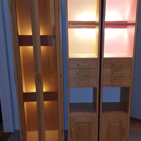 Møblet er lavet af lyst træ med glas i skabslåger. Det har flere hylder og opbevaringsplads.