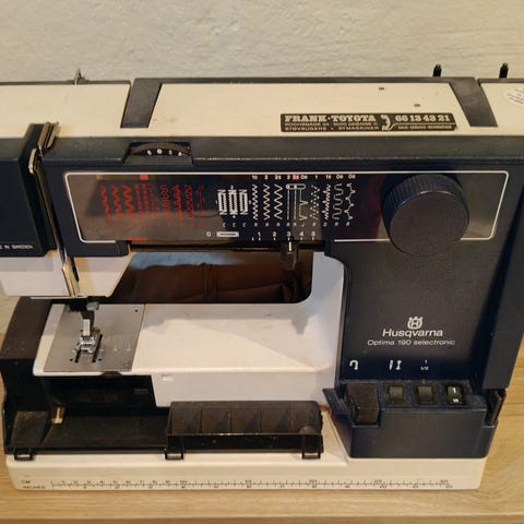 Produktet er en symaskine med 21 programmer. Den har en hvid krop med blå detaljer.,Afhentes i:,Røde Kors Kolding (621),Bemærk at mail, chat og beskeder ikke besvares, og varen skal købes på knappen "Gå til varen"