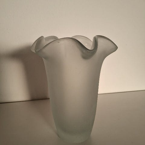 Vasen har en bølget kant og er dekoreret med blåt og hvidt glas. Den har en klar, detaljeret håndtag.,Afhentes i:,Røde Kors Glostrup (161),Bemærk at mail, chat og beskeder ikke besvares, og varen skal købes på knappen "Gå til varen"
