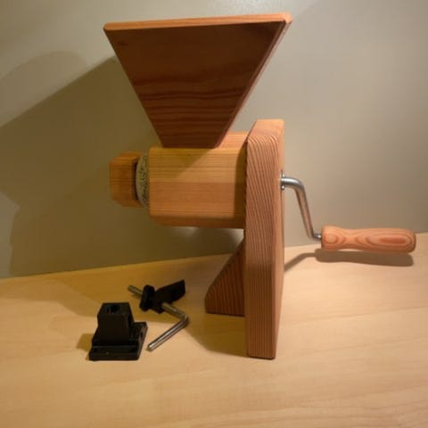 Produktet er en håndholdt kornkværn lavet af træ med en metallisk håndtag. Den har en trapezformet tragt og en robust base. Lækkert design.,Afhentes i:,Røde Kors Sorø (335),Bemærk at mail, chat og beskeder ikke besvares, og varen skal købes på knappen "Gå til varen"