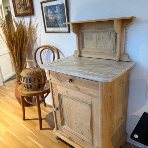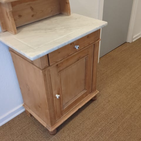 Servanteskab i træ med låge og en skuffe. Overdelen er i marmor uden revner.,Afhentes i:,Røde Kors Ølby/Køge (259),Bemærk at mail, chat og beskeder ikke besvares, og varen skal købes på knappen "Gå til varen"