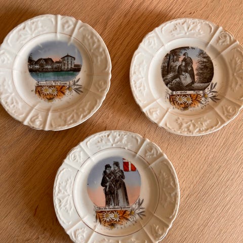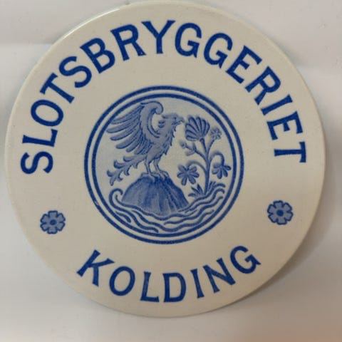 Produktet er en rund keramisk tallerken med dekorationer i blå og hvide nuancer. Den bærer teksten "Slotsmøllens Bryggerier Kolding 1906" og har et motiv af en statue og landskab. Keramikken har en glat overflade.,Afhentes i:,Røde Kors Kolding (621),Bemærk at mail, chat og beskeder ikke besvares, og varen skal købes på knappen "Gå til varen"