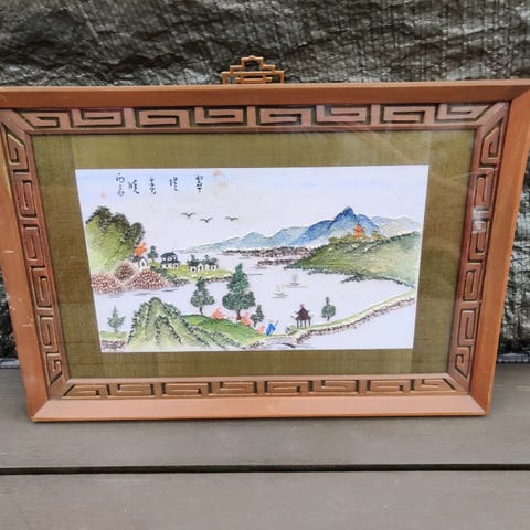 Collage, Jette Grindsted, motiv: Portrætter/Figurer, stil: Impressionisme, b: 43 cm h: 46 cm, Motivets navn "Dame med thekop" og udarbejdet som textilcollage!