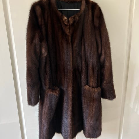 Frakken er lavet af mink, har en bred krave og lange ærmer med ombuk. Smuk kvalitet.,Afhentes i:,Røde Kors Virum (173),Bemærk at mail, chat og beskeder ikke besvares, og varen skal købes på knappen "Gå til varen"