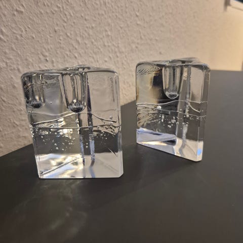 Produkten er to geometriske glasobjekter med en stribet overflade og indviklede indre mønstre. Klart glas.