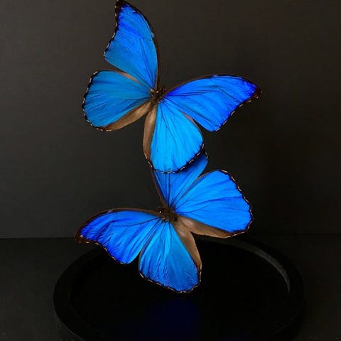 To exotiske Morpho Achilles sommerfugle under en glasglobus i et moderne dekorativt objekt, oprindelse Peru, år 2023, dimensioner 30 × 20 × 20 cm, vægt 1 kg, tilstand god. Klik på den blå "gå til varen" knap, for at købe eller byde på denne vare. Den samlede pris vil blive vist inden du afgiver dit bud.