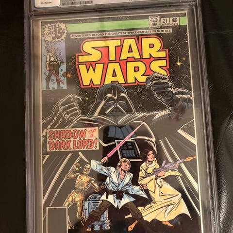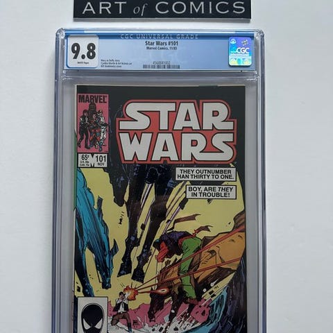 Marvel Star Wars første udgave tegneserie vurderet, nummer 74, udgivet af Marvel Comics i 1983, hæftet indbinding og i mint tilstand (CGC 9.8) med kunstnerne Tom Palmer, Ron Frenz og Jo Duffy. Klik på den blå "gå til varen" knap, for at købe eller byde på denne vare. Den samlede pris vil blive vist inden du afgiver dit bud.