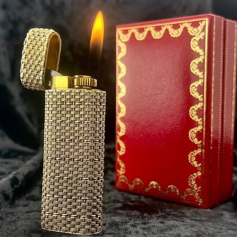 En smuk grøn lakkeret krop med rig dybde og guldbelagt kant. Viser tegn på alder, herunder overfladeskratrer, små ridser og mindre slitage på belægningen, hvilket er typisk for vintage Cartier lightere. Overordnet set har den en yderst attraktiv fremtoning. Venligst se billederne for detaljeret stand.