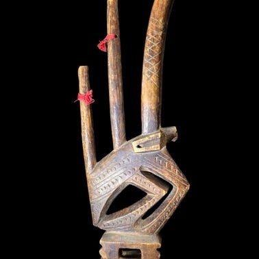 Ansigtet er stærkt stiliseret, med lukkede øjne, i en indadvendt attitude, og hovedet er toppet med imponerende buede horn, et klart symbol på åndelig styrke, magt og forbindelse med åndeverdenen.