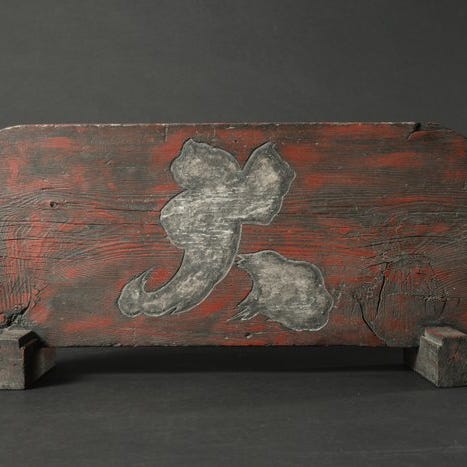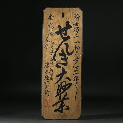 Gammelt træskilt fra Japan, sortlakkeret med gyldne detaljer, reklamerer for barns medicin Sōryūgan og stammer fra sen Edo/ tidlig Meiji-perioden, ca. 69,5 cm høj og 25,5 cm bred, i rimelig stand med tung brug og muligvis mindre dele mangler. Klik på den blå "gå til varen" knap, for at købe eller byde på denne vare. Den samlede pris vil blive vist inden du afgiver dit bud.