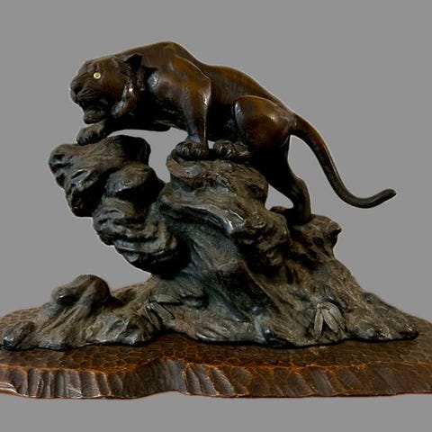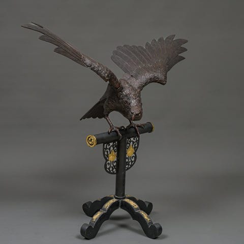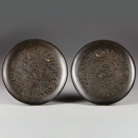 Et par japanske Wa‑abumi haglerrød-lakeret Nashiji-lign, med røde lakkerede kanter, karakusa-mønster og raden-inlay, hver 25,5 cm høj, 29 cm lang og 11,5 cm dyb, samlet vægt 3.930 g, jern med lakeret finish, i fremragende stand og leveres med autenticitetscertifikat. Klik på den blå "gå til varen" knap, for at købe eller byde på denne vare. Den samlede pris vil blive vist inden du afgiver dit bud.