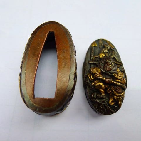 Et antikt par lakerede jern abumi 鐙 (stirrups).