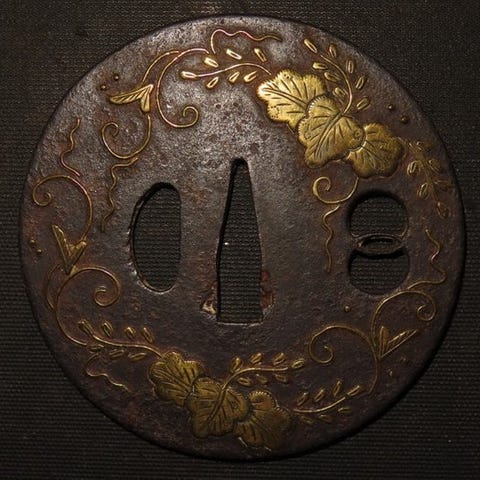 Dette par er af den typiske wa-abumi 鰐鐙 ('svaneformet') form, færdiggjort i rødguld nashiji 梨子地 (sprøjtet guldlak) og omkranset med livlige røde lakkanter. Siderne er dekoreret med et karakusa 唐草 (rullende løv) mønster, der starter i nashiji og overgår i spættet raden 螺鈿 (perlemor) indlæg. Toppen har et åbent vægdesign med en splashende bølge.