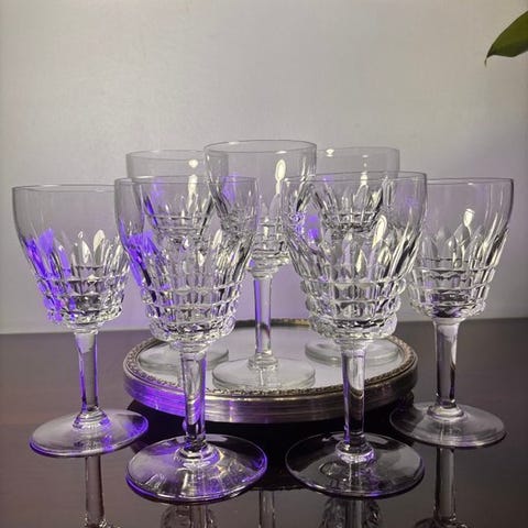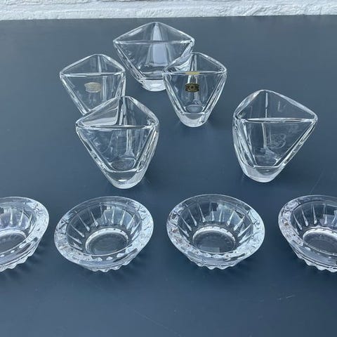 Et forfinet sæt af 8 håndskårne krystalglas fra den anerkendte belgiske krystalproducent Val Saint Lambert, en del af det elegante MERY-service introduceret i 1947. Hvert glas rummer 40 ml, hvilket gør dem perfekte til likører, digestifs, forstærkede vine som portvin eller sherry, eller endda til brug som rince-bouche-glas — små mundrensere serveret mellem retterne.