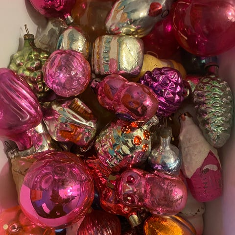 42 smukke håndlavede vintage julekugler i engelsk stil i stof. Forskellige størrelser og designs. Disse er sande blikfang, der garanterer et helt unikt juletræ! I meget god stand, med nogle mindre tegn på slid.