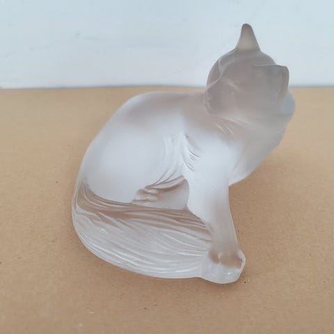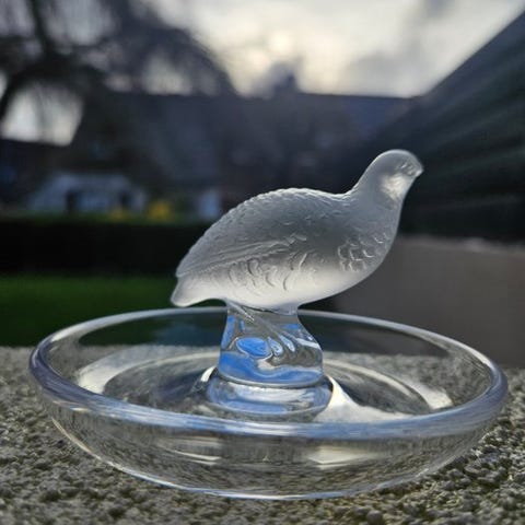 Lalique krystal baguier i Colombe-modellen med udråbne vinger, et Art Déco-stykke fra 1960’erne–1970’erne, krop satin og frostet, kanter og næse poleret til spejl, på en cirkulær base; højde 6,5 cm, bredde 10 cm, dybde 10 cm; i fremragende stand med en lille chips på næbbet, ringer ikke inkluderet. Klik på den blå "gå til varen" knap, for at købe eller byde på denne vare. Den samlede pris vil blive vist inden du afgiver dit bud.
