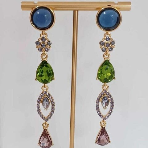 Askew London dametøreringe clip i guldbelagt metal med farverige syntetiske krystaller, vægt 30 g, længde 9,5 cm, bredde 2,4 cm, i fremragende stand uden laboratorierapport, leveres i fløjlsboks. Klik på den blå "gå til varen" knap, for at købe eller byde på denne vare. Den samlede pris vil blive vist inden du afgiver dit bud.