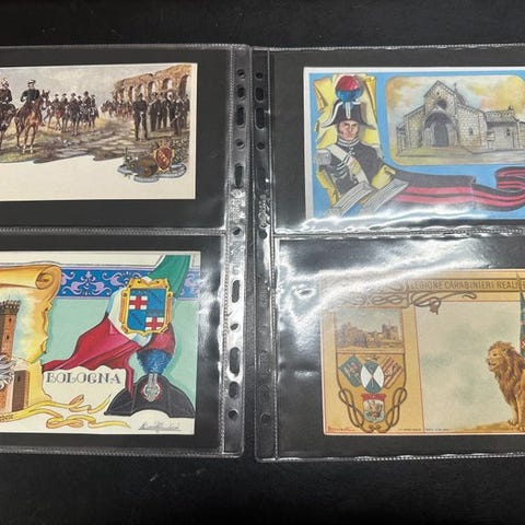 Utrolig samling af postkort af paverne, i Art Nouveau-grafik, alle udgivet i begyndelsen af det 20. århundrede: mellem 1900 og 1903. Hvert kort er et kunstværk i sig selv. Derudover følger en samling på 23 smukke doge-kort samt 10 meget sjældne farvede fotografikort af schweizergardere. De sidste kort vedrører Pave Leo XIII, hans død, det konklave, der fulgte, med en fotomontage af alle kardinalerne, der deltog i konklaven i 1903, og valget af Pave Pius X. Endelig er der også en lille samling på 9 lithografiske kort med udsigter over Rom.