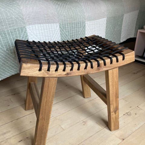 Skrædstol i træ med sæde og stel i stiliseret hvalhaleform, målene 60 cm bred, 38 cm dyb og 49 cm høj; oprindelse Italien; estimeret periode 2010–2020; tilstand: Som nyt – aldrig brugt. Klik på den blå "gå til varen" knap, for at købe eller byde på denne vare. Den samlede pris vil blive vist inden du afgiver dit bud.