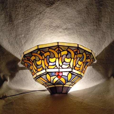 Tiffany-stil hængelampe, håndlavet i den første halvdel af det 20. århundrede. Kroppen består af flere stykker farvet glas, samlet med blyforgyldning, hvilket danner et blomsterligt design med stor farvemætning. Dominerende er varme og naturlige nuancer — røde, grønne, orange og blå — der vækker mindelser om modernismens dekorative sprog, med særlig opmærksomhed på detalje og visuel harmoni.