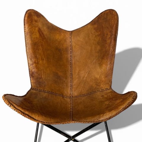 Smuk sommerfuglestol med sæde i tykt brunt læder.