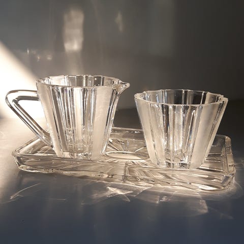 Disse smukke Wilhelmina-kopper i smukke lilla og blå farver er blevet støbt i 1923 ved Glasfabrikken i Leerdam efter design af A.D. Copier.