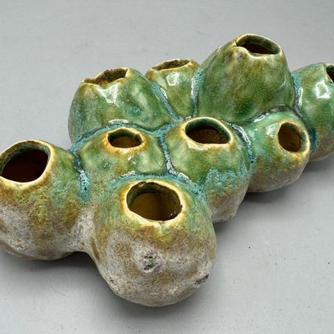Bronceglaseret stentøjsvase designet af Johannes Jacobus van der Vaart i Amsterdam, Holland omkring 1988, benævnt 'Buttocks' Multipel vase, dimensioner 12 cm bred, 9,8 cm høj og 8,5 cm dyb, i fremragende stand. Klik på den blå "gå til varen" knap, for at købe eller byde på denne vare. Den samlede pris vil blive vist inden du afgiver dit bud.
