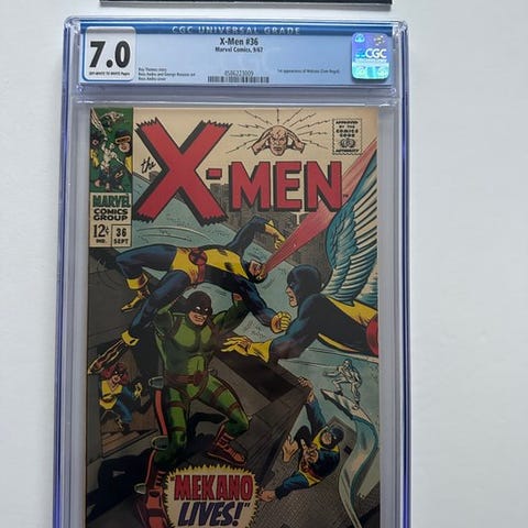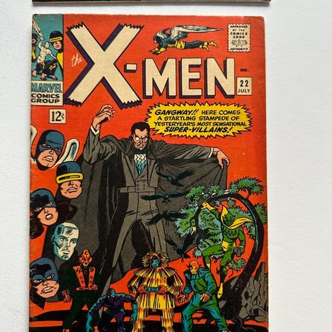 X-Men-kommikket, første udgave (1966) udgivet af Marvel Comics, nummer 23 med Count Nefaria, Eel, Unicorn, Porcupine og Scarecrow, tegninger af Werner Roth, Dick Ayers og Roy Thomas, hæftet sammen og i meget god stand. Klik på den blå "gå til varen" knap, for at købe eller byde på denne vare. Den samlede pris vil blive vist inden du afgiver dit bud.