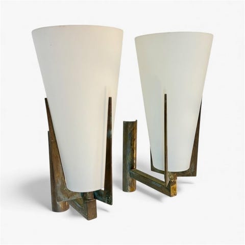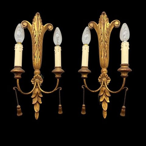 Et par vægkandelabre med porcelanske papegøjer og bronzeomskifter i en eklektisk Hollywood Regency stil, håndmalet og i fremragende stand; hver genstand måler cirka 51 cm i højden, 35 cm i bredden og 14 cm i dybden. Klik på den blå "gå til varen" knap, for at købe eller byde på denne vare. Den samlede pris vil blive vist inden du afgiver dit bud.