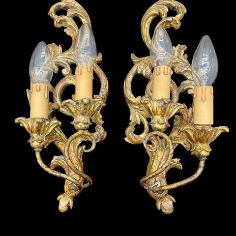 Et par smukke porcelæns papegøjer som væglysestager. Eklektisk stil og Hollywood regency. Bronzefarvede væglysestager med porcelænsornamenter (papegøje og blomster). Smukke stykker af høj kvalitet, håndmalet. Meget flot vægdekoration i Hollywood regency-stil. Rigtige øjefangere.