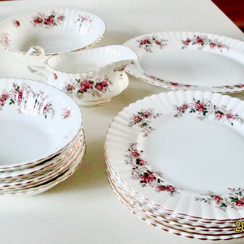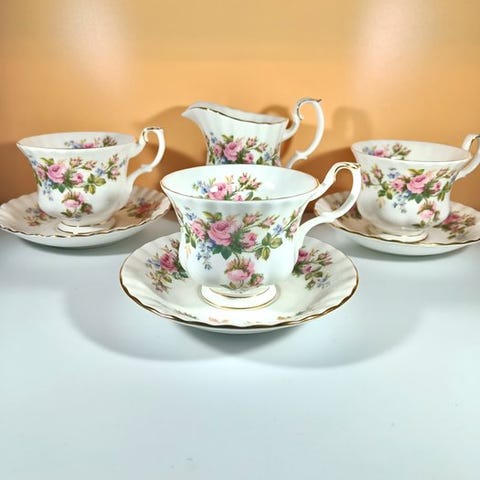 Royal Albert 'Moss Rose' side tallerkener – benporcelæn, England (ca. 1956)