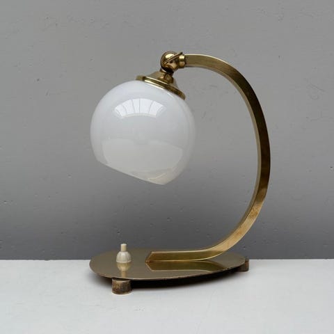 Art Deco bordlampe af forkromet messing med et lysegult opaliseret glas; højden er 55 cm, skærmdiameter 13 cm, foddiameter 14 cm, E27-stik, justerbar og i funktion, fremstillet i Nederlandene. Klik på den blå "gå til varen" knap, for at købe eller byde på denne vare. Den samlede pris vil blive vist inden du afgiver dit bud.