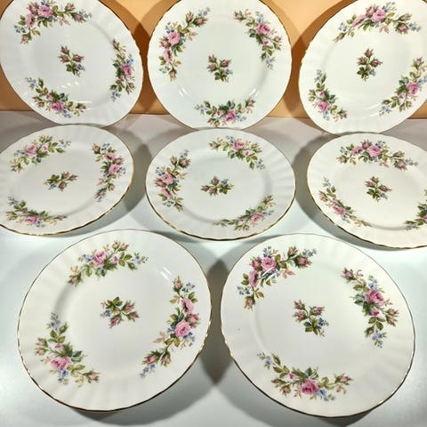 Et udsøgt tallerken og matchende serveringsfad fra Royal Albert, fremstillet i fint engelsk benporcelæn og dekoreret med det berømte 'Moss Rose'-mønster. Designet viser blidt skyggefulde lyserøde roser, delikate blå blomster og blid løv, arrangeret i en harmonisk blomsterkomposition, der afspejler den tidløse elegance af klassisk engelsk bordservice.