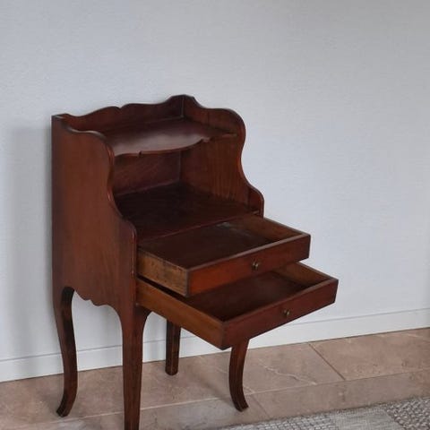 Par engelske Chippendale sengeborde med skuffer i mahogni, omkring 1900–1910, i god brugt stand med mindre tegn på alder og pletter, dimensioner 44 × 32 × 63 cm, vægt ca. 5 kg. Klik på den blå "gå til varen" knap, for at købe eller byde på denne vare. Den samlede pris vil blive vist inden du afgiver dit bud.