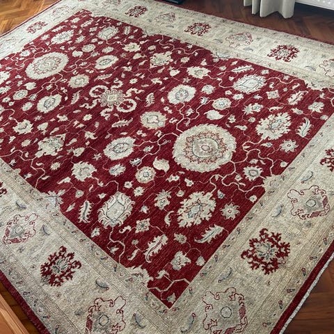 Det er et helt nyt Zigler-tæppe, aldrig brugt, fra Pakistan. Det er til salg, fordi tæppebutikken lukker. Designet og farvekombinationerne er meget attraktive. Se venligst billederne.