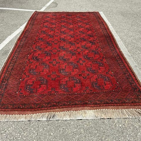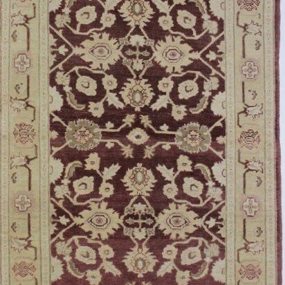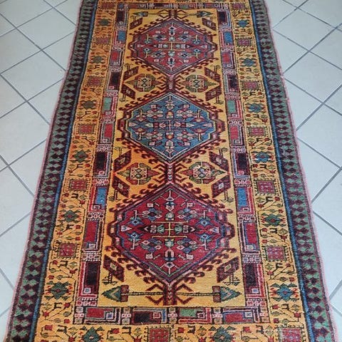 Håndknyttet orientalsk tæppe i uld, meget tyndt, uden centralt medaillon. På en beige, rød og blå baggrund. Omkranset af en stor blomsterkant.