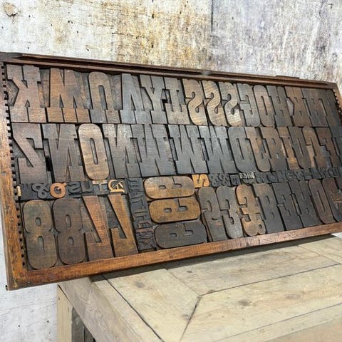 Unikt og autentisk dekorativt element, bestående af to trækasser indeholdende en sammensætning af gamle typografiske bogstaver i træ og metal.