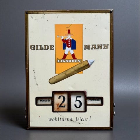 Dette reklamevægur, der bærer Dunhill International's ikoniske slogan 'De fineste cigaretter i verden', blev brugt som et dekorativt objekt i barer og cigaretbutikker fra den tid. Med sin træramme og minimalistiske urskive er det et iøjnefaldende stykke i vintage tobaksreklamekollektioner.
